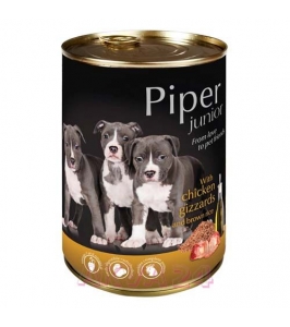 Súčasťou rady PIPER Junior je aj krmivo určené pre šteňatá a ich špecifické výživové potreby. PIPER Junior konzerva s kuracími žalúdkami a hnedou ryžou obsahuje ľahko stráviteľné obilniny vo forme hnedej ryže, ktorá má pozitívny vplyv na tráviaci trakt. Krmivo je obohatené o lososový olej s Omega 3 a Omega 6 mastnými kyselinami pre zdravú kožu a lesklú srsť šteniat , ľanový olej je prírodným zdrojom esenciálnych nenasýtených mastných kyselín, prispieva ku skvalitneniu srsti a pozitívne ovplyvňuje nervový systém.
